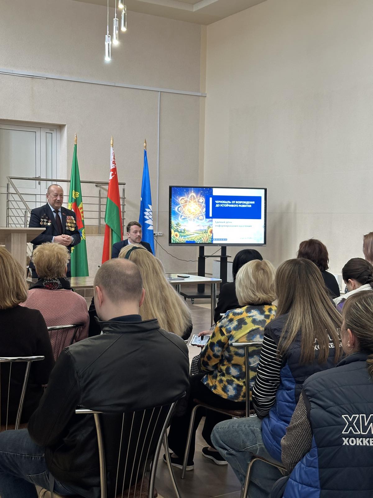 Сергей Петрович Козлов, майор запаса, летчик 1-го класса, кавалер трёх орденов Красной Звезды, ветеран войны в Афганистане, ликвидатор аварии на Чернобыльской АЭС, член Новополоцкой городской организации «Белорусский союз ветеранов войны в Афганистане» рассказал участникам собрания о трагедии, произошедшей 26 апреля 1986 года на Чернобыльской АЭС, о её последствиях, а также о мерах социальной направленности государства по преодолению последствий катастрофы.
